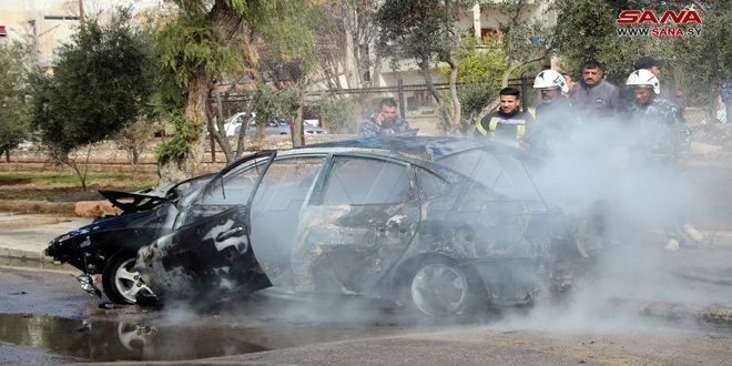 An explosive device planted by terrorists in a car went off in Yusuf al-Azmeh suburb in Damascus countryside, a source at Damascus countryside Police Command said.